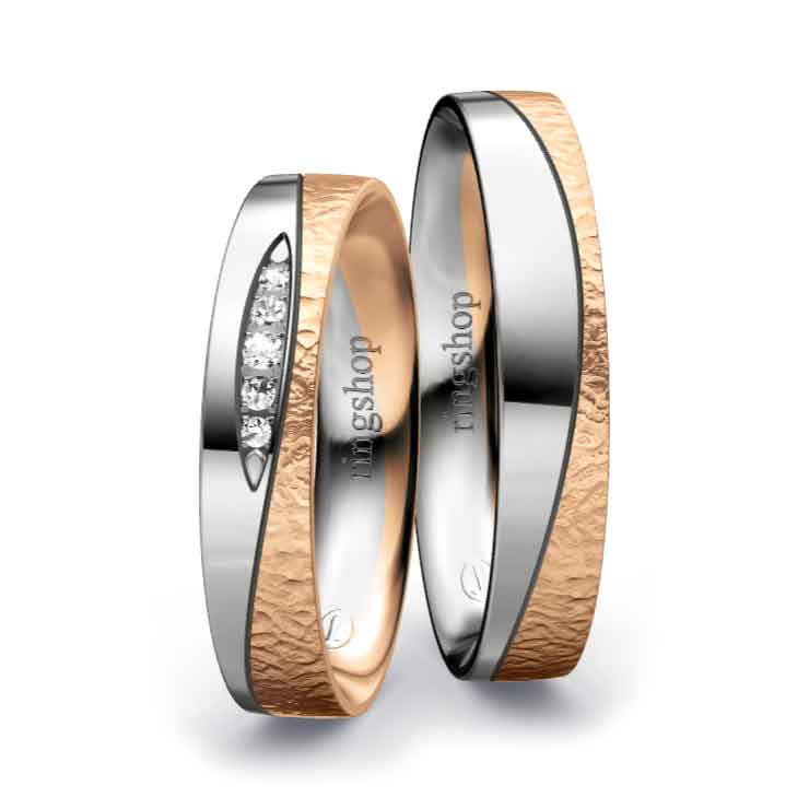 Rotgold: Es handelt sich um eine Legierung aus Feingold, Kupfer und Silber mit Goldanteilen zwischen 333/- und 750/-. Der etwas größere Kupferanteil sorgt für die namensgebende „rote“ Färbung und Härte des Materials. Der elegante und gleichermaßen zeitlose Farbton ist Kupfer ähnlich.