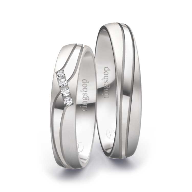 Palladium: Das mit Platin verwandte Metall Palladium erhält mit einem Feingehalt von 950/- eine besonders helle und strahlende Oberfläche. Mit einem Feingehalt von 500/- ist es deutlich dunkler wie etwa Graugold.