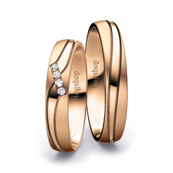 Rotgold: Es handelt sich um eine Legierung aus Feingold, Kupfer und Silber mit Goldanteilen zwischen 333/- und 750/-. Der etwas größere Kupferanteil sorgt für die namensgebende „rote“ Färbung und Härte des Materials. Der elegante und gleichermaßen zeitlose Farbton ist Kupfer ähnlich.