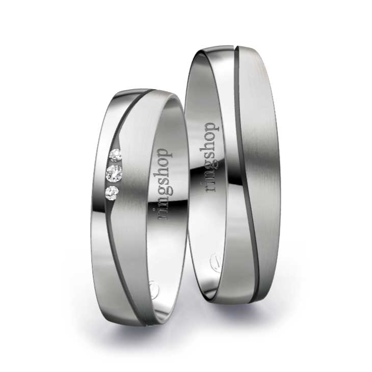 Palladium: Das mit Platin verwandte Metall Palladium erhält mit einem Feingehalt von 950/- eine besonders helle und strahlende Oberfläche. Mit einem Feingehalt von 500/- ist es deutlich dunkler wie etwa Graugold.