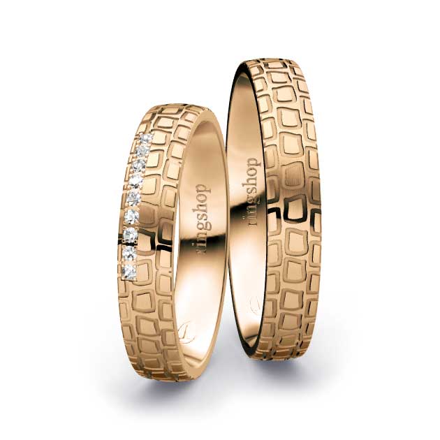Rotgold: Es handelt sich um eine Legierung aus Feingold, Kupfer und Silber mit Goldanteilen zwischen 333/- und 750/-. Der etwas größere Kupferanteil sorgt für die namensgebende „rote“ Färbung und Härte des Materials. Der elegante und gleichermaßen zeitlose Farbton ist Kupfer ähnlich.