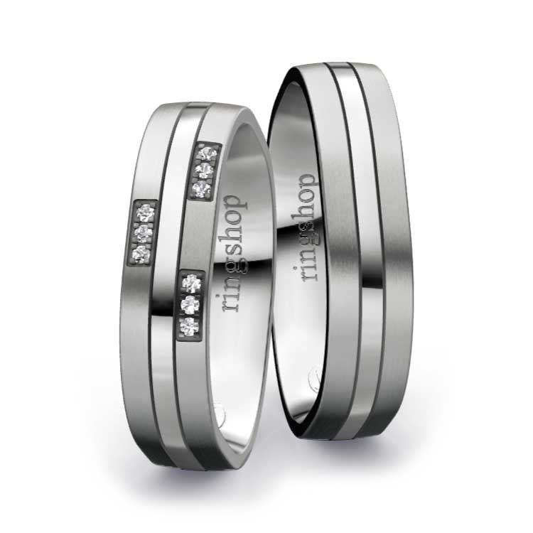 Palladium: Das mit Platin verwandte Metall Palladium erhält mit einem Feingehalt von 950/- eine besonders helle und strahlende Oberfläche. Mit einem Feingehalt von 500/- ist es deutlich dunkler wie etwa Graugold.