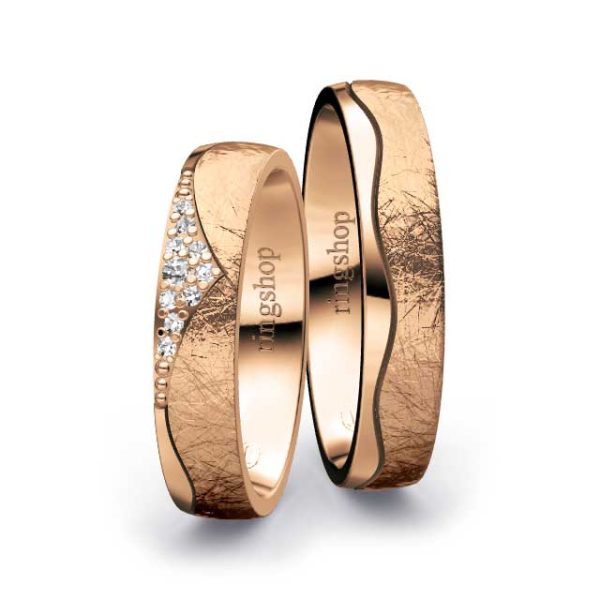 Rotgold: Es handelt sich um eine Legierung aus Feingold, Kupfer und Silber mit Goldanteilen zwischen 333/- und 750/-. Der etwas größere Kupferanteil sorgt für die namensgebende „rote“ Färbung und Härte des Materials. Der elegante und gleichermaßen zeitlose Farbton ist Kupfer ähnlich.